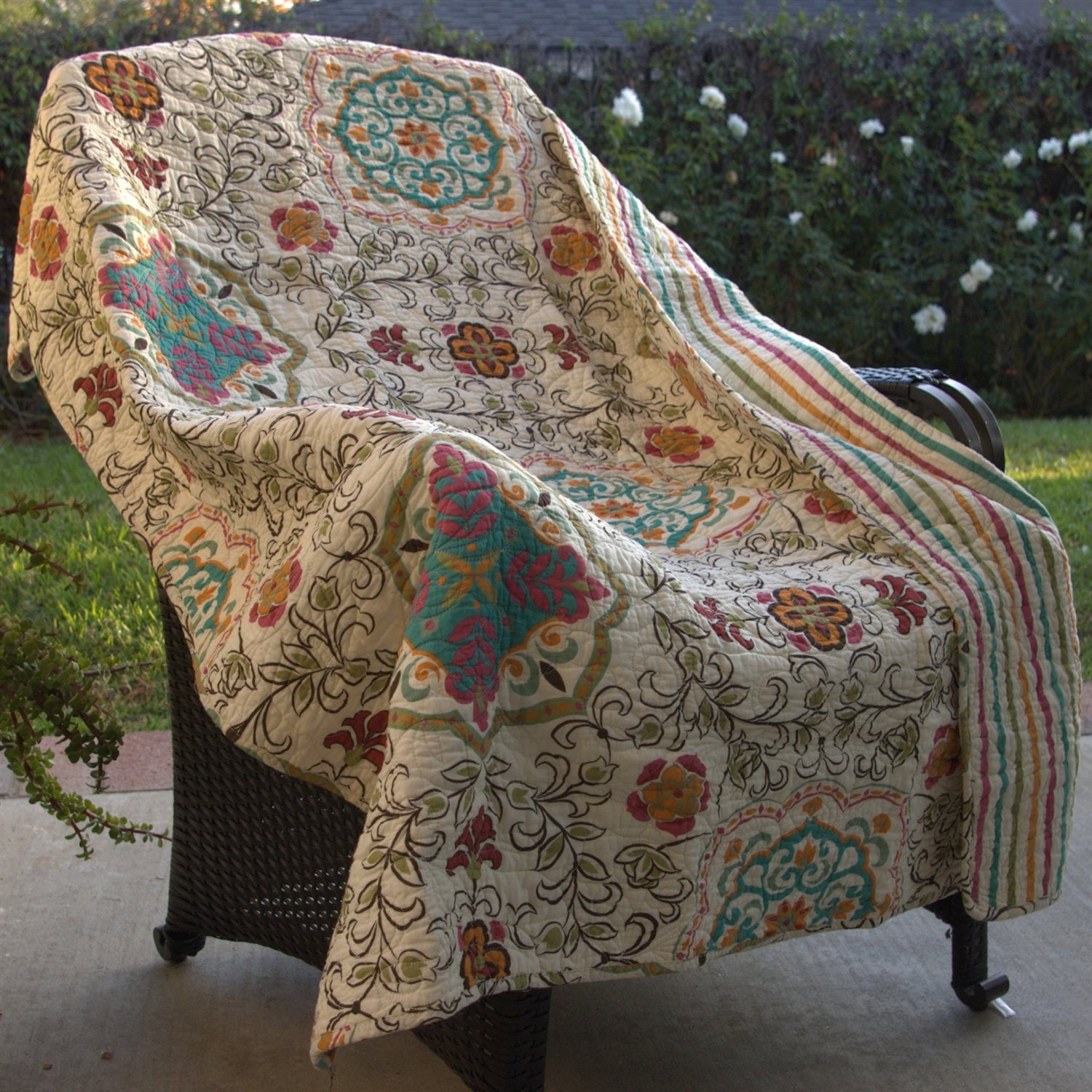Exotic and inviting, this 100% Cotton Throw Quilt Blanket with Bohemian Style Floral Pattern takes its inspiration from the bohemian lifestyle. Reverses to an all-over coordinating vibrant stripe for a two look in one. Intricate stylized floral stitch pattern in a rich, vibrant and earthy color palettes sets the romantic mood with a bit of vintage flair, perfect for any season.